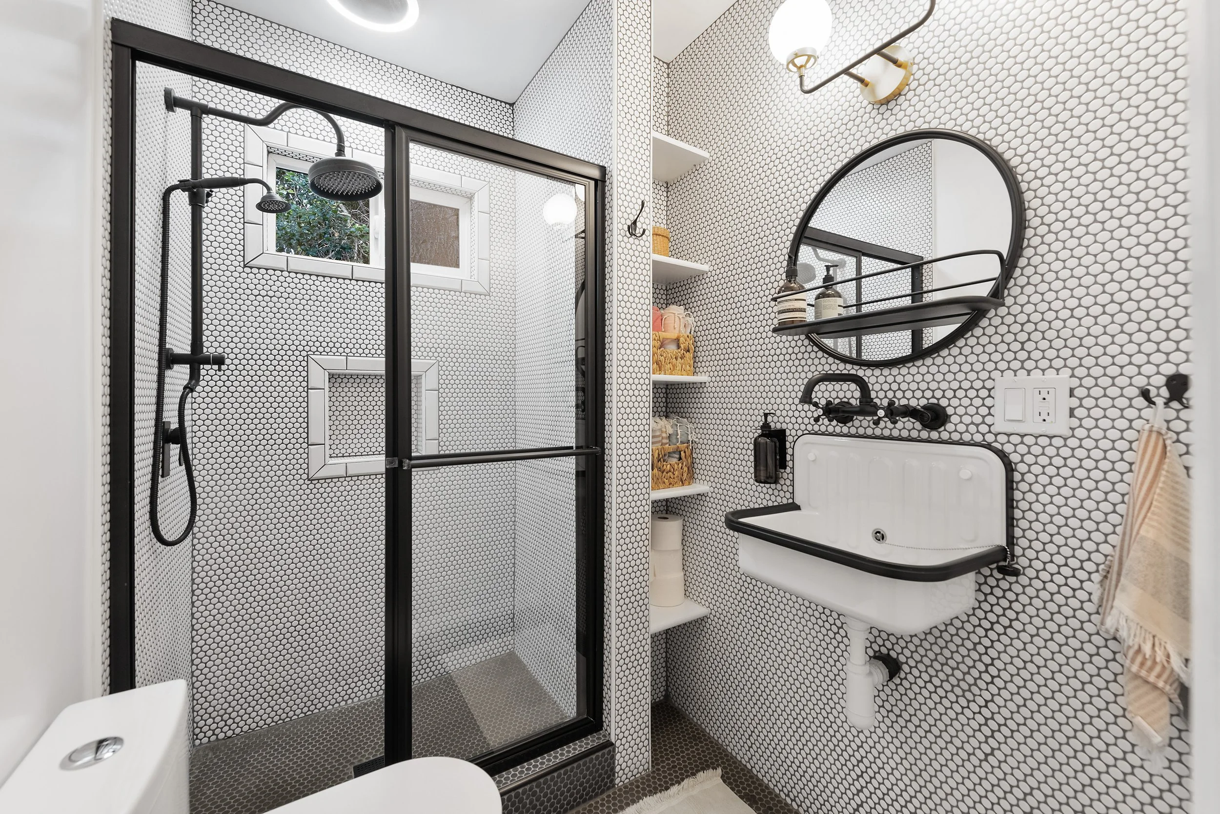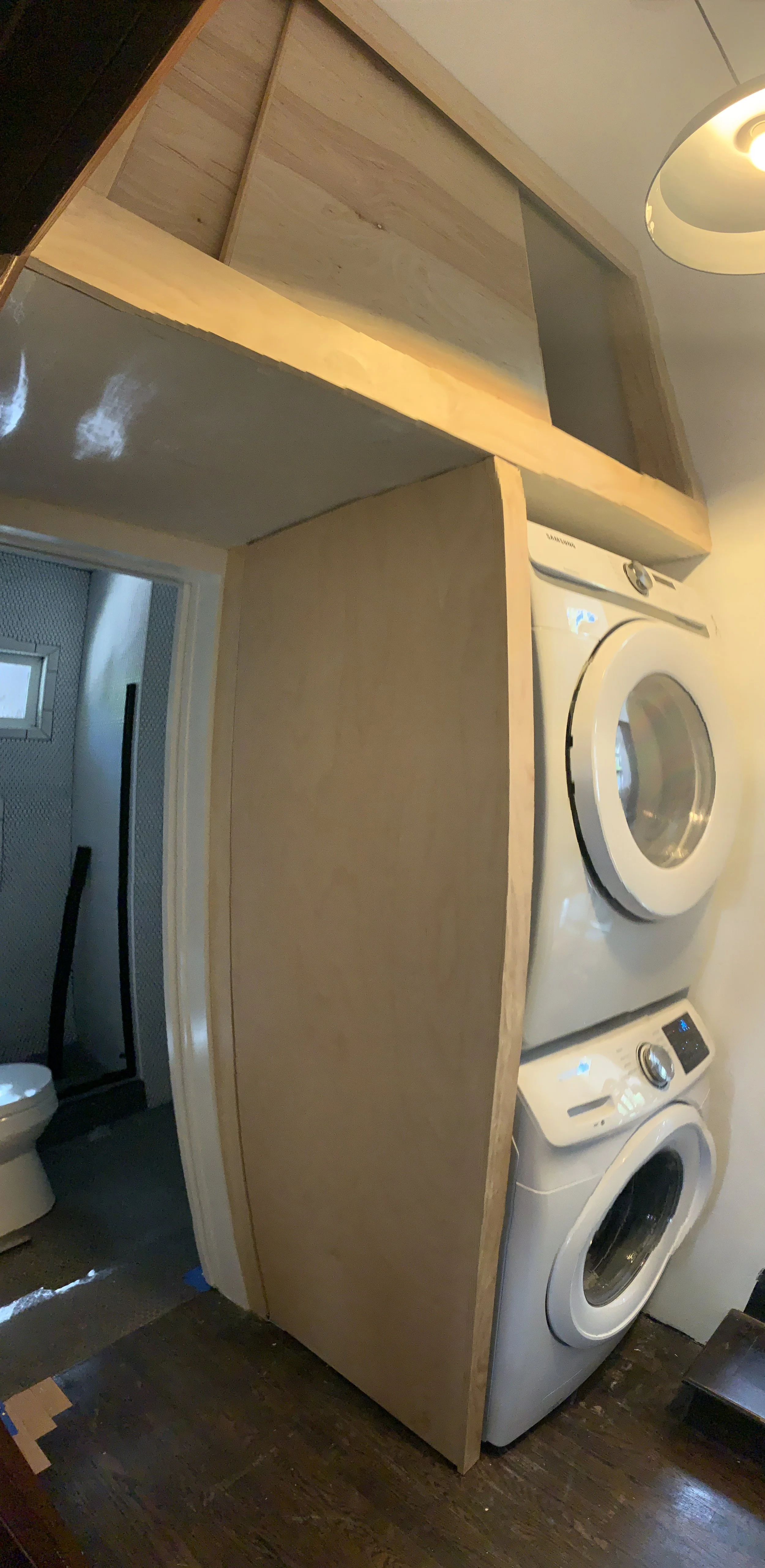 We had to create a nook for the washer&dryer and optimize the space creating a cute penny tile bathroom room